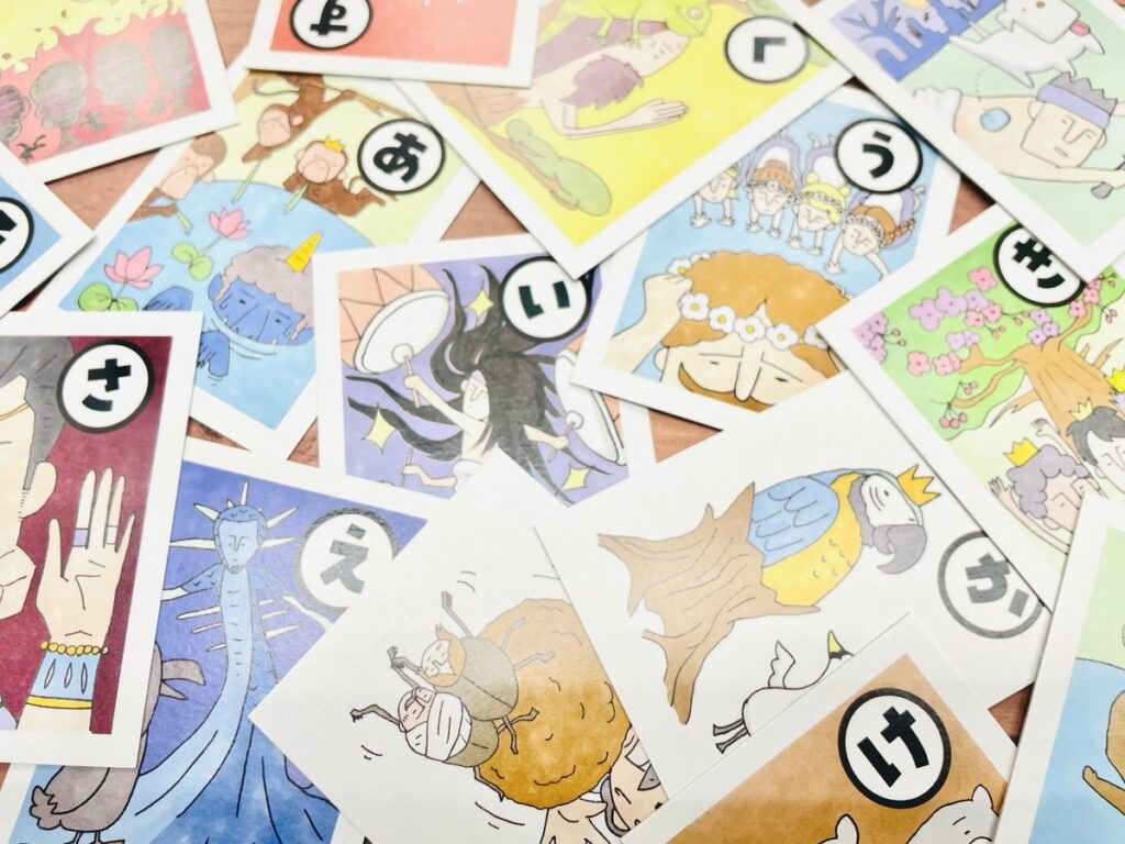 文字が読めない小さいお子さんなども一緒に遊べるように、読み札にはイラスト(絵札)の特徴も記載して、読み手が文章とともに紹介できるように。